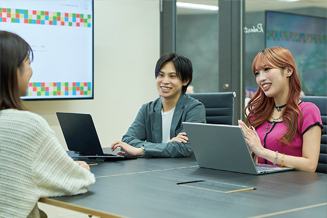 当社では、入社後3日間の研修でビジネスマナーの基礎などを学ぶ。その後は1カ月かけて座学で業務の基本プロセスを習得し、続く1カ月はOJTで先輩社員に付いて実務を身に付けていく。何か困ったときには、すぐに先輩社員にサポートしてもらえる環境があり、定期的に行われる1on1の面談で不安を解消できる体制も整っている。