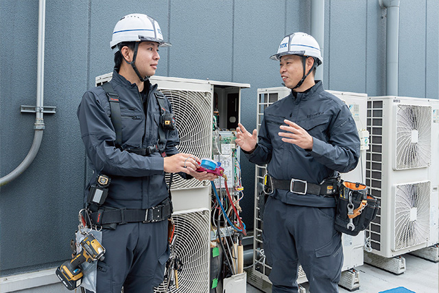 空調設備などのメンテナンスや改修工事を担う。複数の工程に精通した人材へ着実に成長できる
