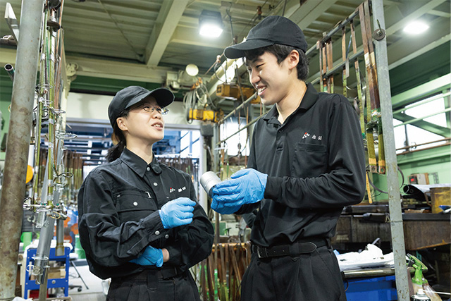 「当社には、ものづくりが好きという志望理由で入社した社員が多いです」と前澤マネージャーが語る通り、めっき加工そのものにやりがいを感じる社員が多いという。特に難易度の高い加工案件が持ち込まれることも多い同社では、営業担当・めっき担当・磨き担当がそれぞれ意見を出し合いながら作業を進めるなど、その都度工夫し、時には技術を応用し新たな加工方法を導き出す点が魅力となっている。