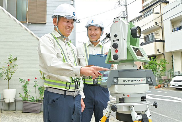 高精度な測量技術を先輩の丁寧な指導で身に付ける。社会インフラを支えているという実感とともに成長