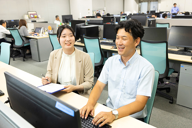 入社後はビジネスマナーや基本情報処理、プログラミング言語の研修を経て、正式配属となる。現場ではOJTで少しずつ仕事の範囲を増やしていく。同社では、OJTの期間を最大10年間と長めに取っており、ある程度経験を積んでも上司や先輩のサポートを受けることが可能。一定の経験を積むと後輩をサポートする役割も担うため、指導をしながら自ら成長しマネジメント力を身に付けることができる。