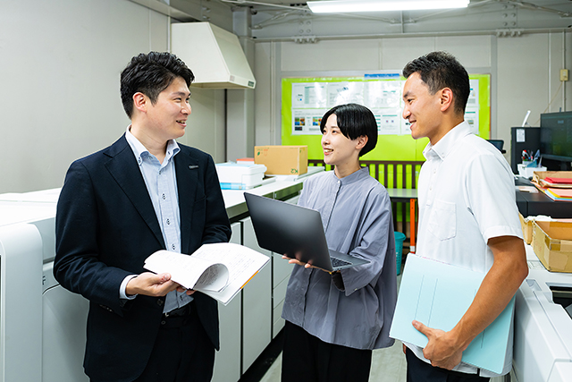 「私は以前、別の印刷会社で工程管理を担当していたのですが、当社に転職してからはマーケティングや広報を担当しています。私自身の考え方や発想を重視しながら『マーケティングとしてはこう考えた方が良い』というように、上司や先輩方から丁寧な指導をしてもらいました。意見を尊重してもらえるので、質問もしやすいですし、他部署の人とも話しやすい環境です」(入社4年目、マーケット開拓部の岡﨑さん)