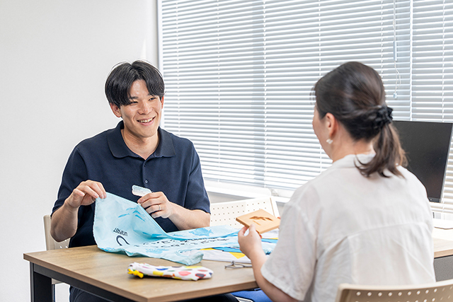 「スポーツ施設を持つお客様から、認知度アップのためにオリジナルグッズを作りたいというお話をいただき、エコバッグにその競技で使う用具の形をした同素材の収納袋を付けるという提案をして、とても喜ばれました。後日、そのオリジナルグッズを持った人を見かけたときは、話しかけたくなるほど嬉しかったです」