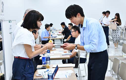 企業担当者に向けたオリエンテーションから始まり、その後、交流会がスタート。企業担当者は足早に各学校のブースへと進まれました。10分を目安に、次の企業担当者と入れ替わる方式のため、真剣な表情で交流を図られていました。