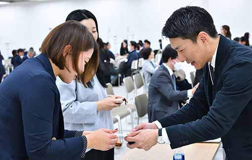最初に企業担当者向けに最近の学生の傾向や、交流会の注意事項などのオリエンテーションがあった後、交流会がスタート。企業担当者は、足早に各学校のブースへ足を運びました。交流時間は10分が目安ということもあり、真剣な表情で交流を進めていました。