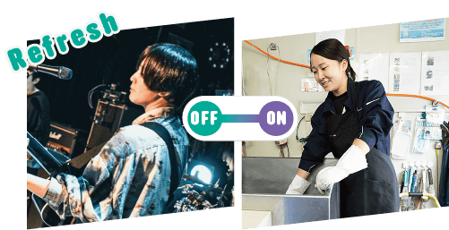 学生の頃からバンド活動をしていて、オフはギターで好きな曲を弾いたり、読書や動画を見て過ごしています。休日だからといって、無理に予定を詰め込まず本当にやりたいと思ったことだけをするようにしています。好きなことが億劫にならないよう、体力をまず回復させてから趣味に没頭することが自分流のオフです。仕事ではシステム管理や給与計算と、ディーゼル車の排ガス浄化装置の洗浄を担当。仕事の時間と自分の時間を切り替え、しっかりメリハリつけています。精神的にも体力的にも充実すると十分な睡眠が取れるため、翌日のパフォーマンスが違います。