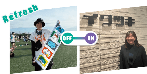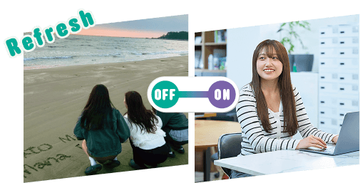 実家に帰って家族とゆっくり過ごすことや、友達と旅行やライブに行くことにオフの時間を使っています。自分の好きなことに集中し、仕事のことを考えず完全にリフレッシュすることが大切。しっかり睡眠を取って心身を整えるよう心掛けています。職場では総務として、備品の発注、社員の勤怠管理や入退社手続き業務、経理や広報などの幅広い業務を担当しています。オフの時間にリフレッシュすることで、仕事中の集中力や判断力が高まりました。特に月末月初の業務や複数タスクを同時に進める場面で、効率よく対応できるようになり、生産性の向上を実感しています。