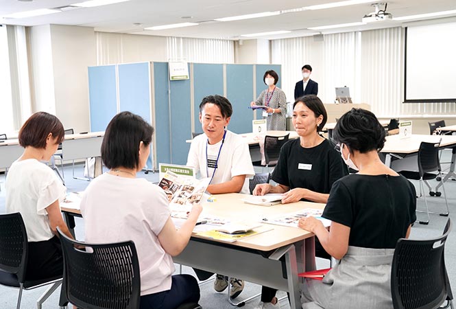 参加者と企業の交流の時間は1社あたり12分間。Zoomでの交流をするブースを含め5チームで参加者と企業が交流します。企業からはどのような事業を行っているのか、女性の働きやすさについてはどんな取り組みをしているかなどが説明され、参加者が質問し、率直な会話が飛び交いました。参加者がいったん離職した理由は子育て、介護、体調面など様々ですが、参加企業からは「今後もいろいろな中小企業と出会い、自分も相手を面接するつもりで質問し、相性のよいところを見つけてください」「子育てや介護などでフルタイム勤務が難しくても、正社員という形にこだわらず仕事を続け、また正社員に戻るというやり方もできる時代です」など、参加者に応援のメッセージが寄せられました。