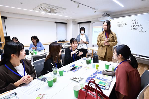 その後、参加学生のサポーターとなる若手社員の紹介を経て、2グループに分かれたワークがスタート。今回は3種類の日本茶商品を試飲した上で、いずれかの商品に的を絞ってマーケティング手法を考えることになりました。参加者は積極的な発言を行い、まずどの商品をアピールするか、ターゲットは、どこで、どんな方法でマーケティングを実施するかを話し合っていきます。参加学生が意見をまとめ、それぞれの案を発表した後、橋本社長と若手社員からフィードバックをいただきました。