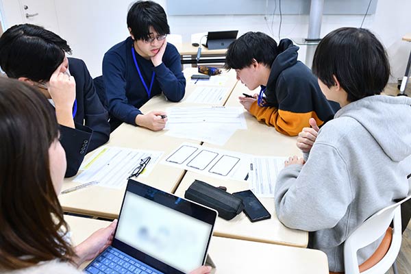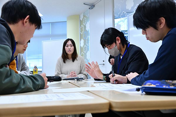 その後、2グループに分かれてワークがスタート。「社員が、ライフ・ワーク・バランスを充実させるためにはどんなアプリがよいか?」個人ごとに案を出し、グループ内で共有。働き方を見直すような機能を盛り込むことを話し合いました。各グループにアシスタントとして入った先輩社員のアドバイスで、参加学生たち自らの考えをブラッシュアップしていきます。それぞれ身を乗り出して熱のこもった話し合いが行われ、充実した時間が流れました。